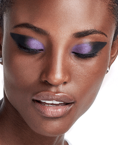Stuck in a night-out makeup rut? Break out of it in a big way with this multi-dimensional take on the classic cat eye. Prismatic purple paired with midnight black, applied with hyper graphic precision is just the kind of high drama to shake up your makeup routine. Here’s how to get it.