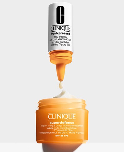 The Fresh Pressed Daily Booster with Pure Vitamin C 10% is packed with ascorbic acid that starts working the second it touches your skin—to brighten and even retexturise your skin over time. And because vitamin C is a powerful antioxidant that helps improve skin health, when it’s combined with Superdefense SPF25 Fatigue + 1st Signs of Age Multi-Correcting Cream, the Continuous Recharge Technology in the cream unlocks to reload antioxidants like vitamin C, so you experience continuous antioxidant protection.