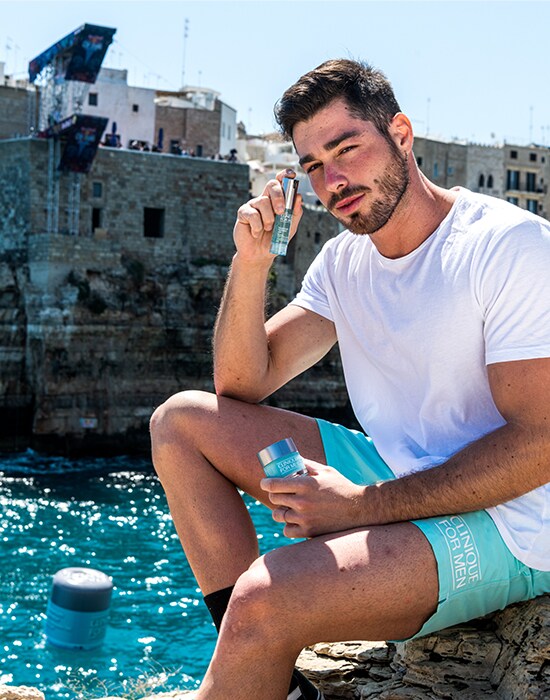 Tucked away along the southern Adriatic coast of Italy, Polignano a Mare is where the clear blue sky meets the sparkling blue sea—a true #BlueOasis. It’s also where Red Bull hosts their annual cliff diving competition over one weekend filled with adrenaline-pumping acrobatic feats and hundreds of high energy spectators. What better place to test drive the newest Clinique for Men hydrators, which keep skin hydrated through even the most extreme conditions.